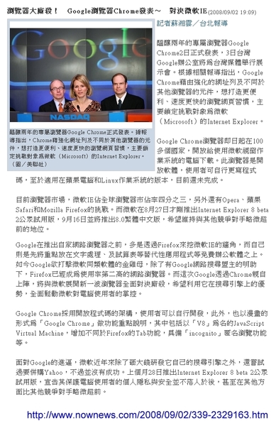 Google於9/2正式推出自家瀏覽器Google Chrome,其推出期間恰巧選在微軟IE8.0beta版到正式繁體中文版的中間,傳聞與其一較高下的意味濃厚。